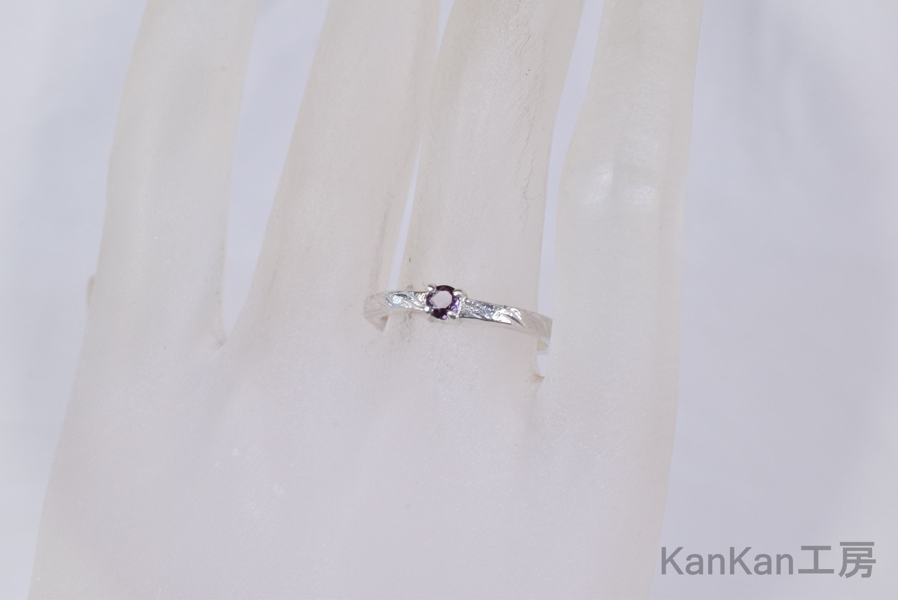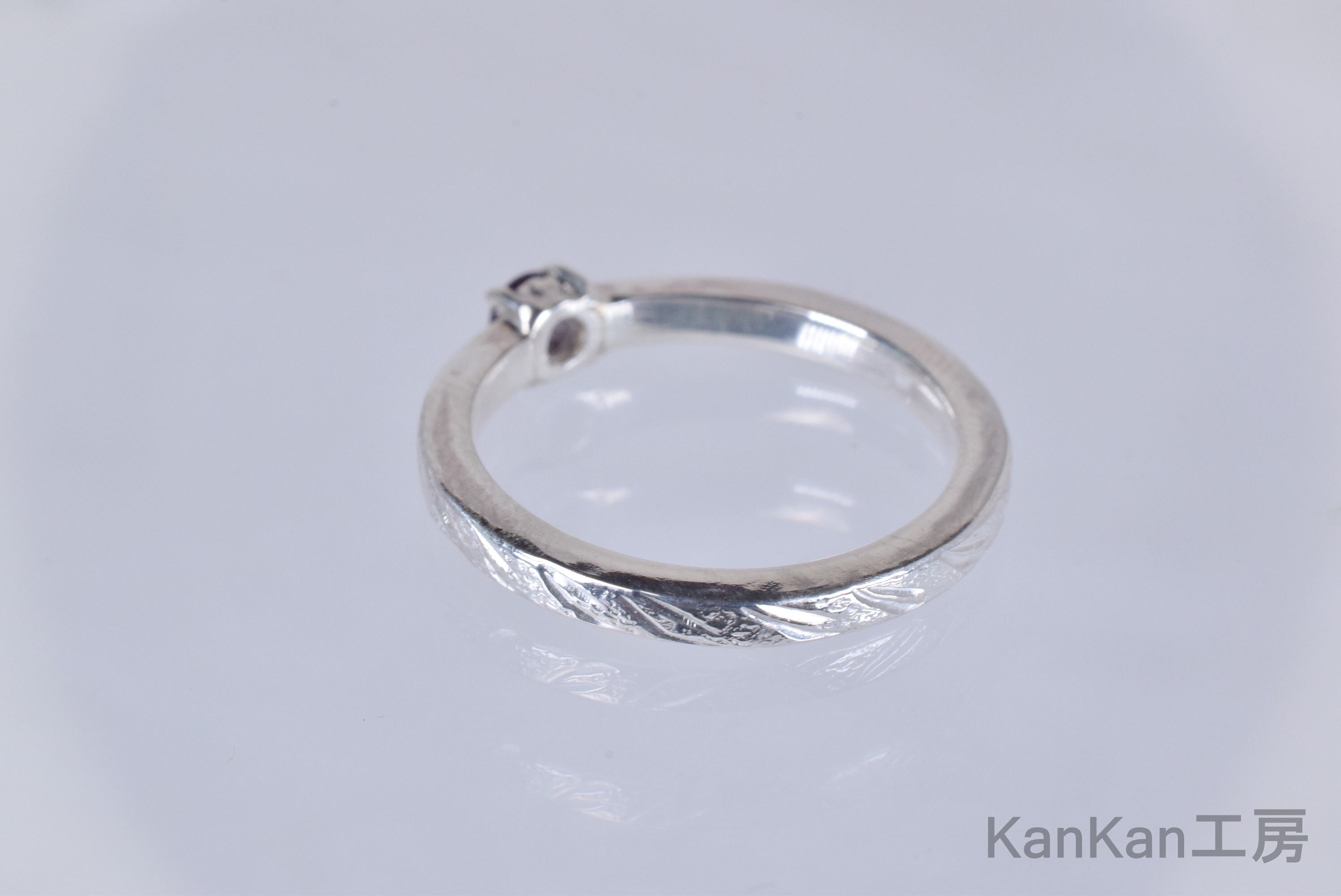 ガーネットとして硬度も申し分なく、小粒ながらカットも綺麗です。荒らした下地をベースにして、全周に彫り模様を施しました。石の大きさもリングは場と同等程度であるため重ね付けにも向いたつくりをしています。