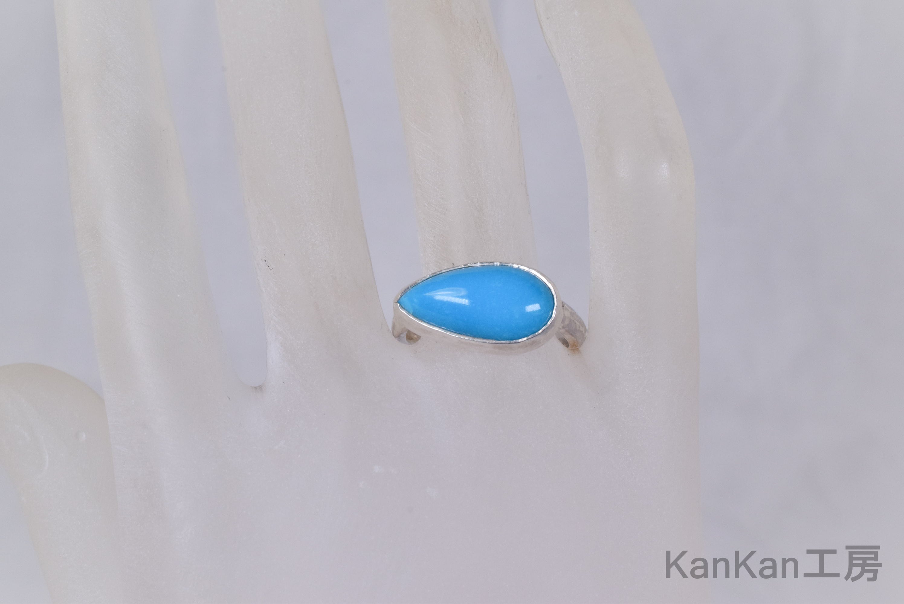 細長いドロップ型カボションのターコイズです。メイトリックス(蜘蛛の巣状の模様)はなく、産出鉱山も不明です。濃い目の水色が美しいターコイズです。