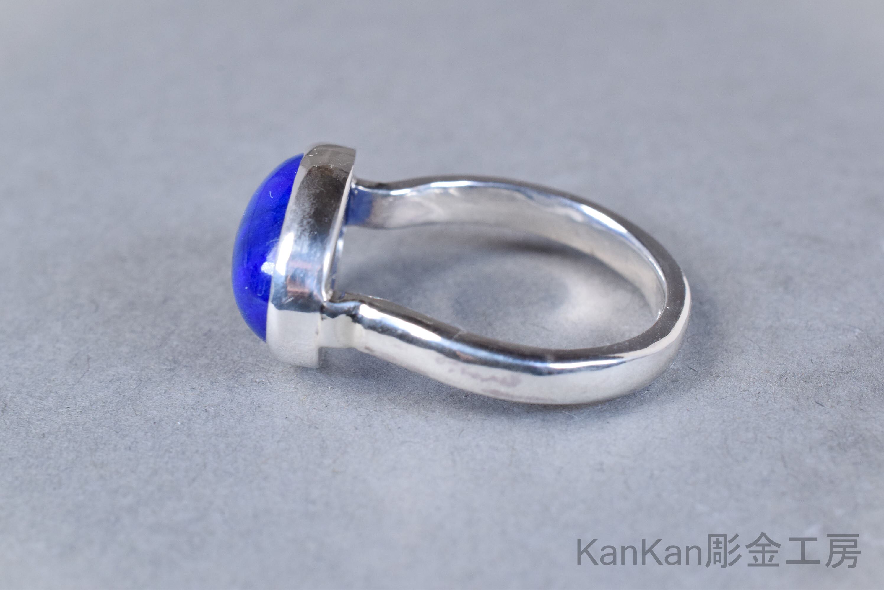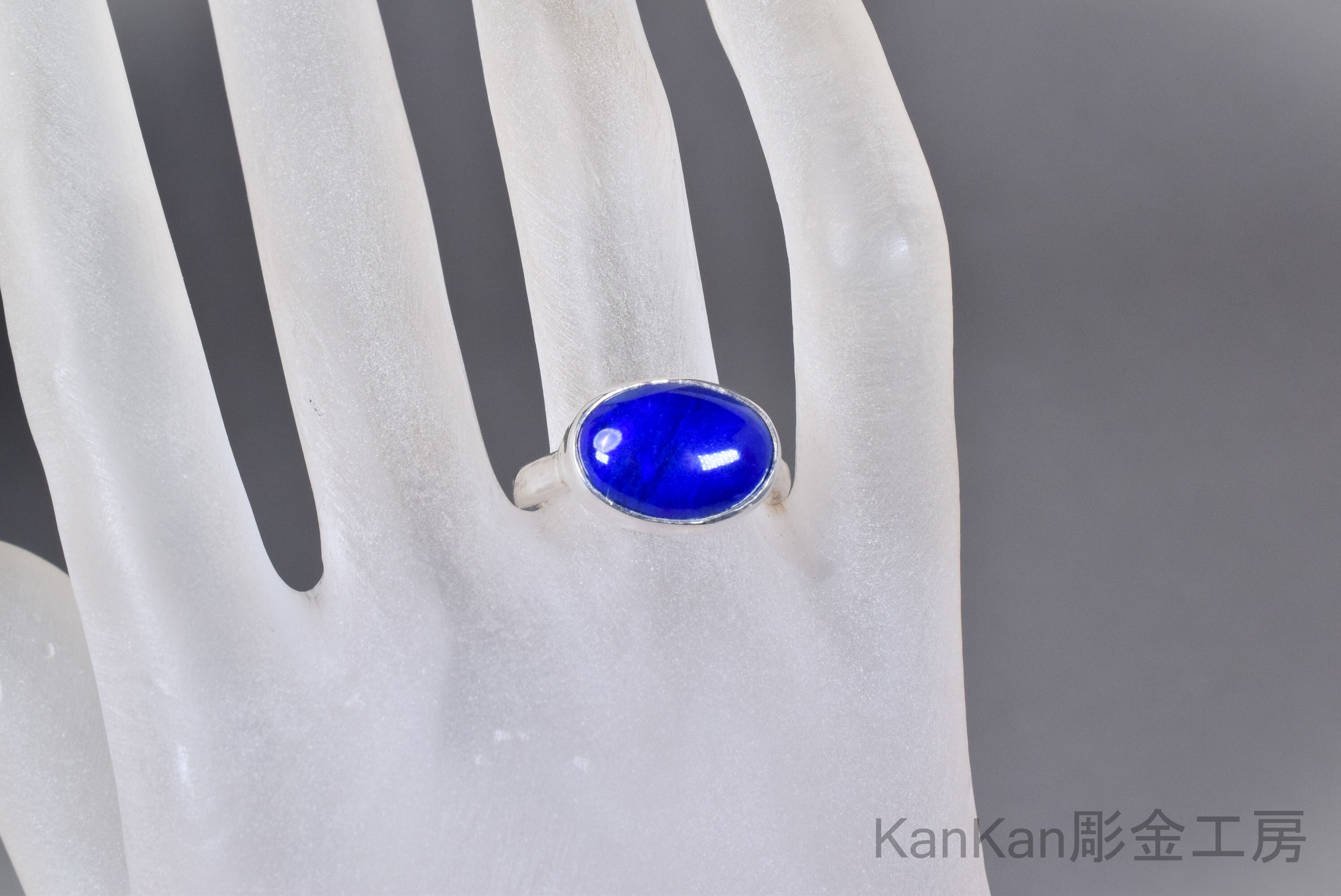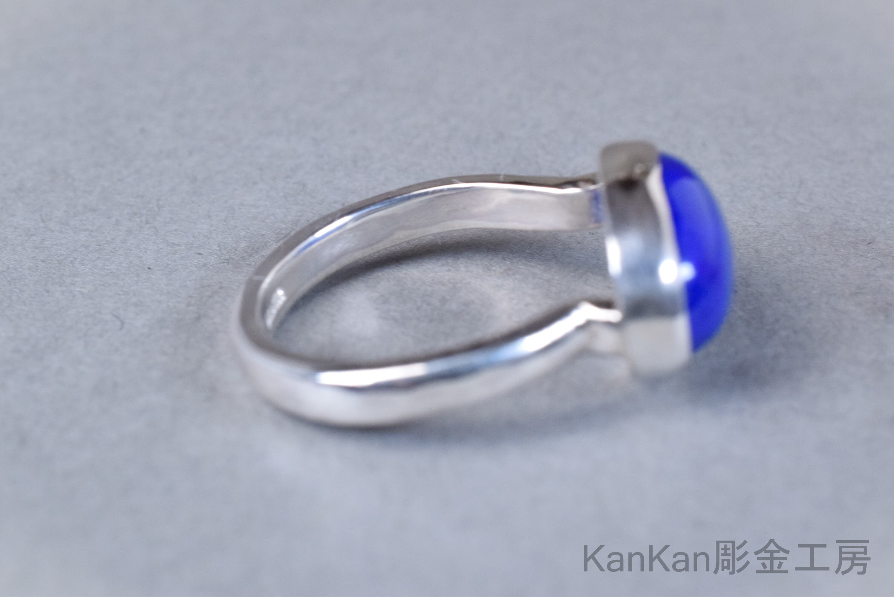 肌にも良く映える藍色を留めた指なじみの良い覆輪留め、甲丸のリングです。
