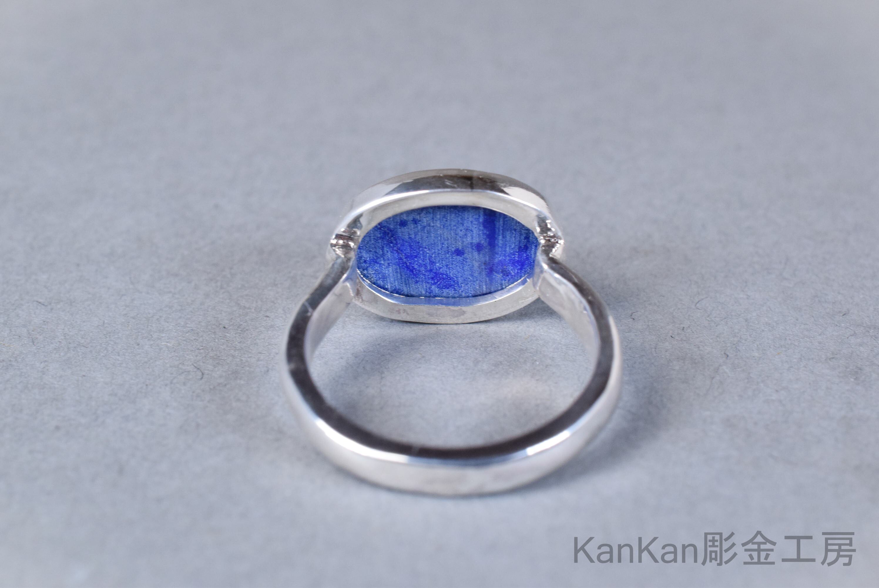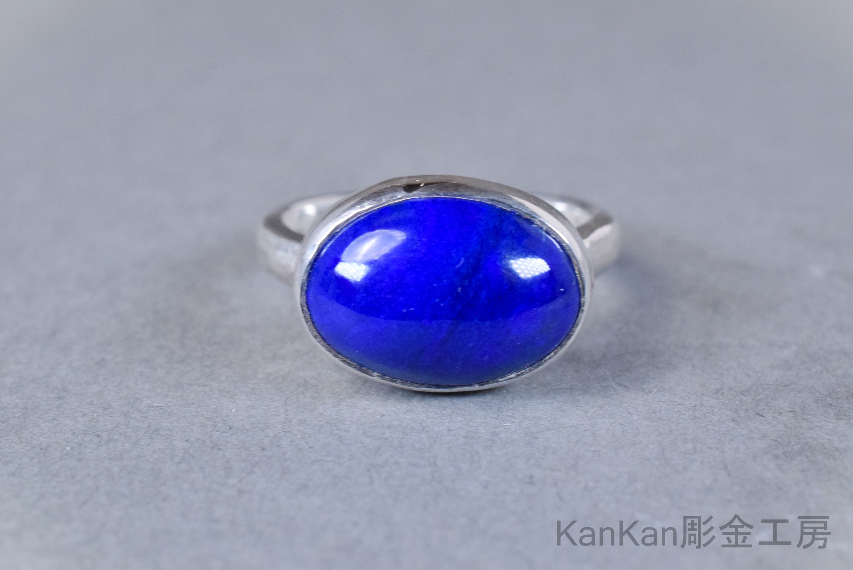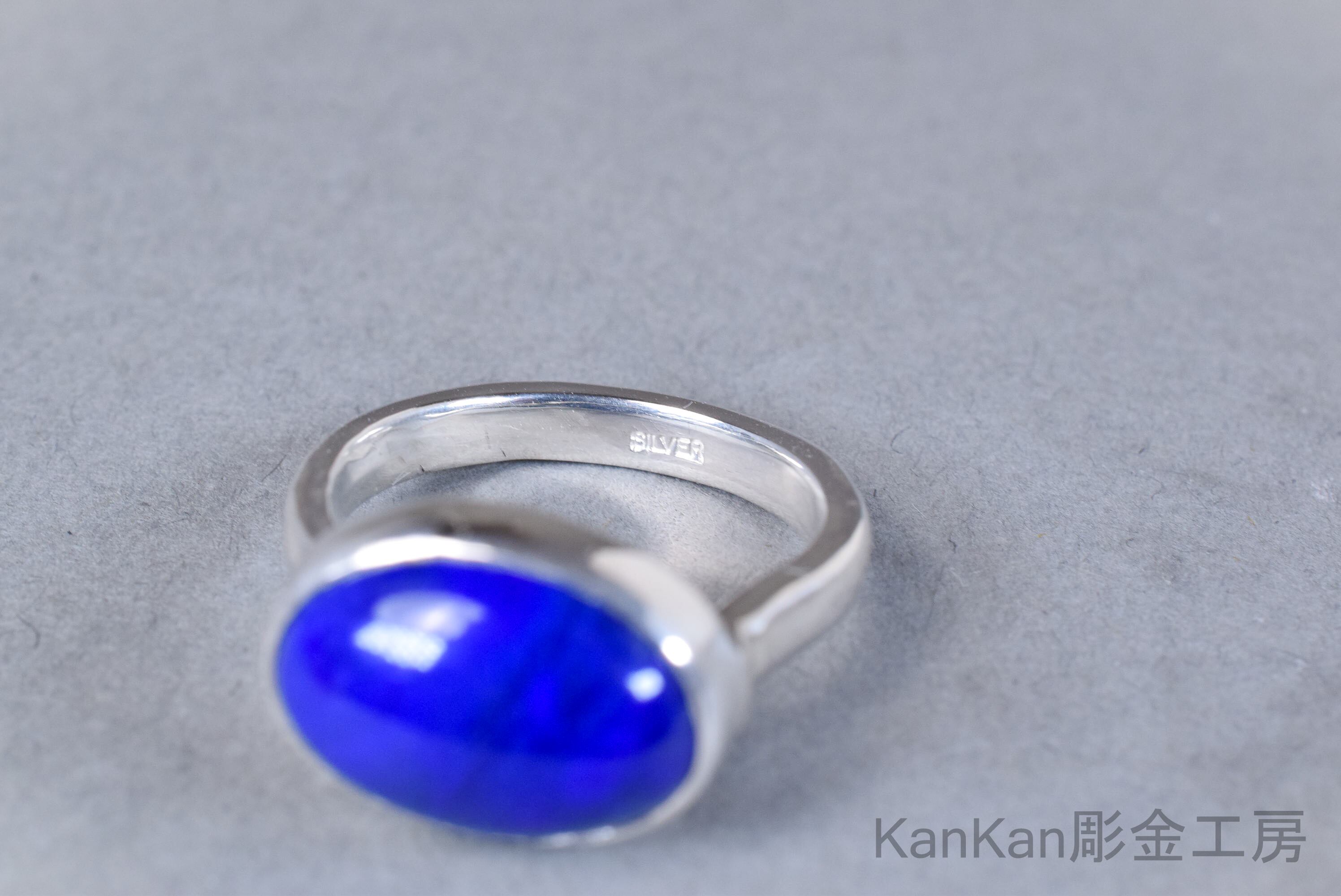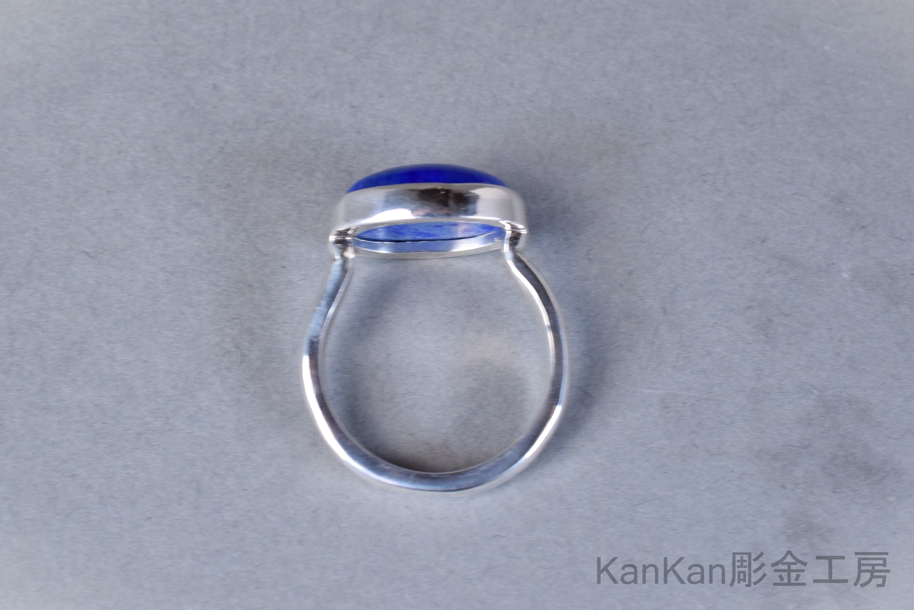 肌にも良く映える藍色を留めた指なじみの良い覆輪留め、甲丸のリングです。