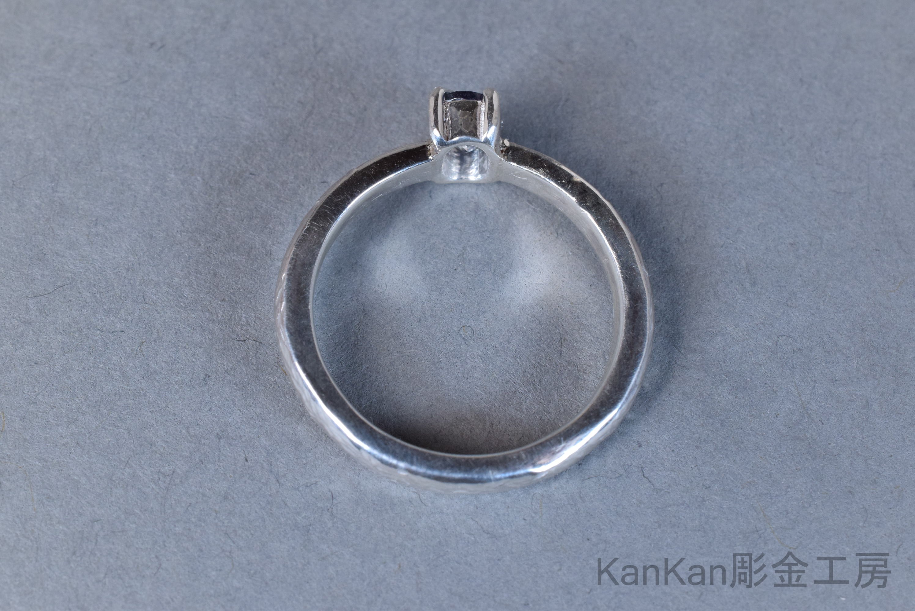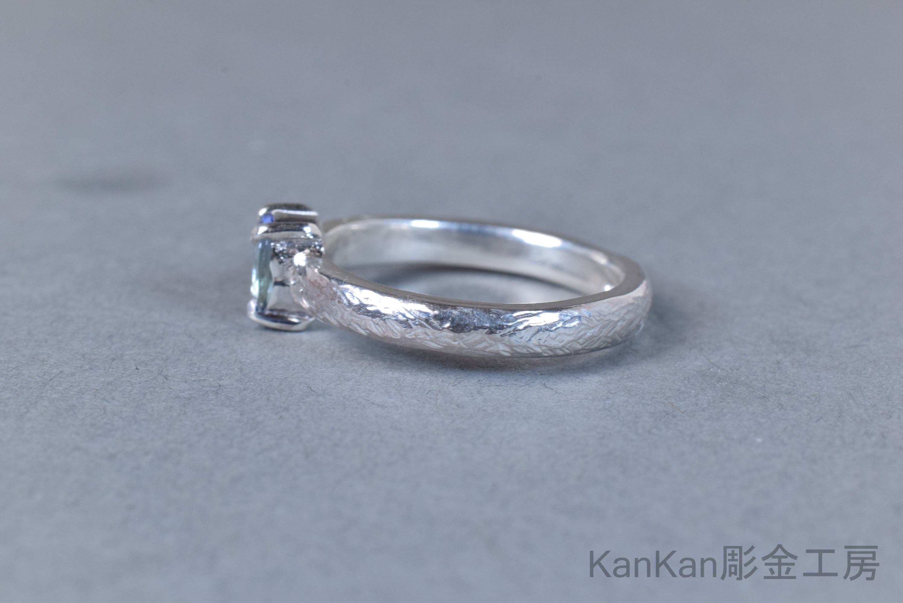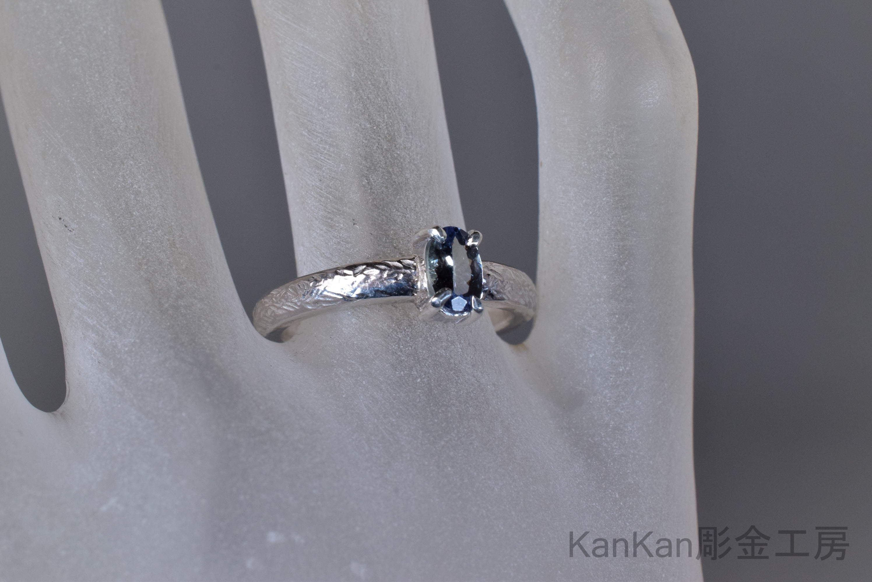 石の青と呼応する筋状の槌目を全周に施しました。