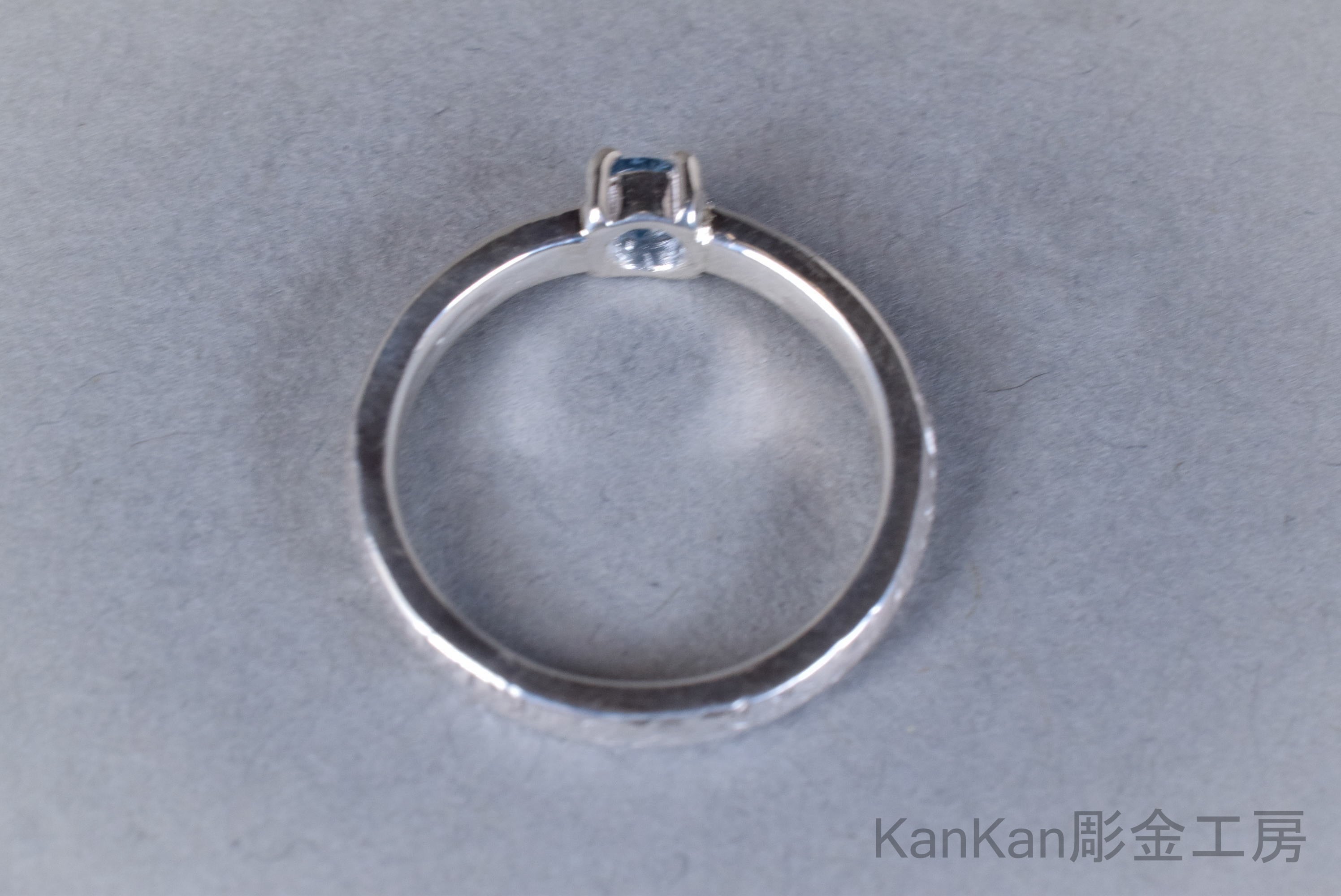 金属の細かな反射と、アクアマリンの青の対比が特徴的なリングです。